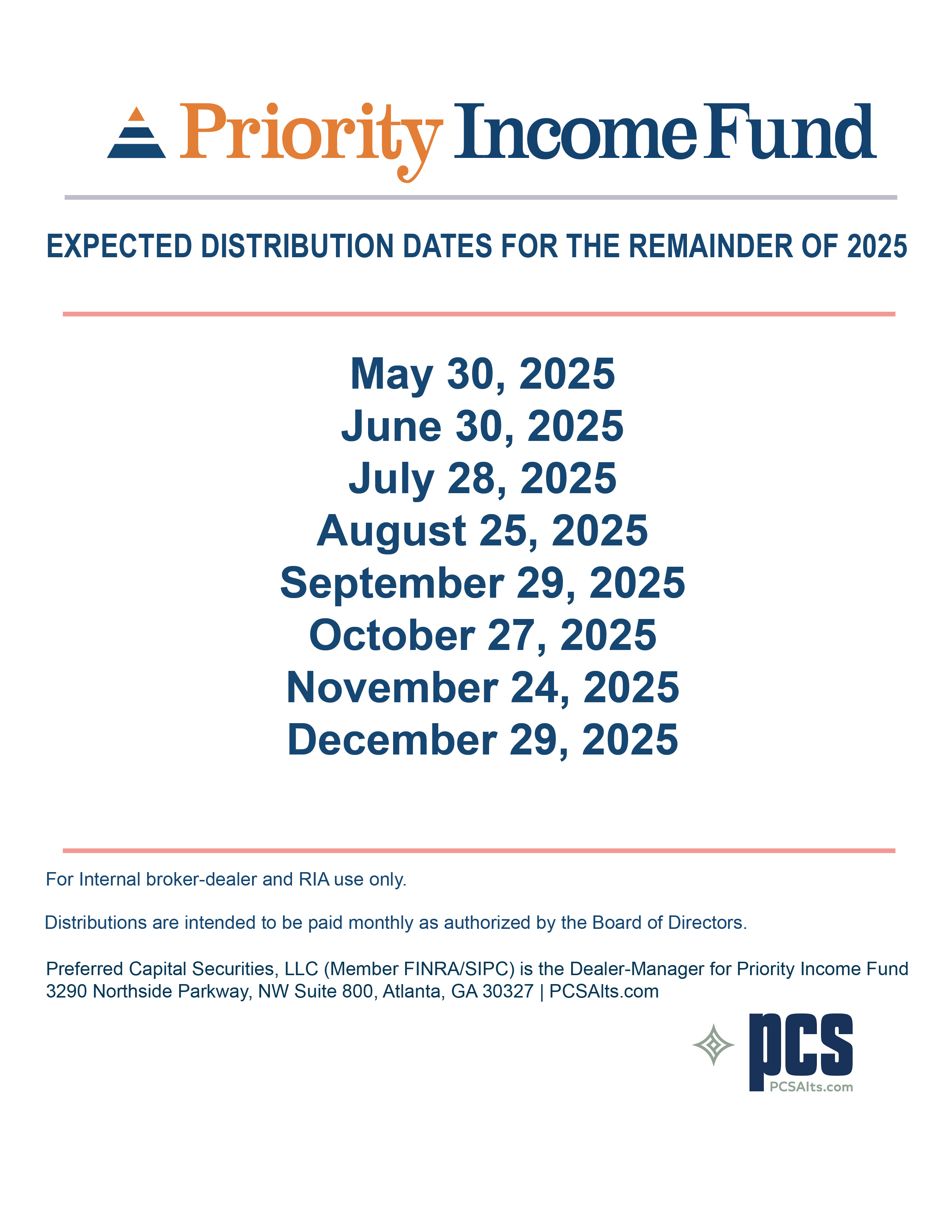 © 2020 Priority Income Fund, Inc. The material contained on this website is not intended to be a recommendation or investment advice, does not constitute a solicitation to buy or sell securities, and is not provided in a fiduciary capacity. The information provided does not take into account the specific objectives or circumstances of any particular investor, or suggest any specific course of action. Investors should consider the investment objective and policies, risk considerations, charges and ongoing expenses of the Fund. The prospectus and summary prospectus contains this and other information. To obtain a prospectus, please contact your investment representative or Preferred Capital Securities at (855) 422-3223, or e-mail investorservices@pcsalts.com